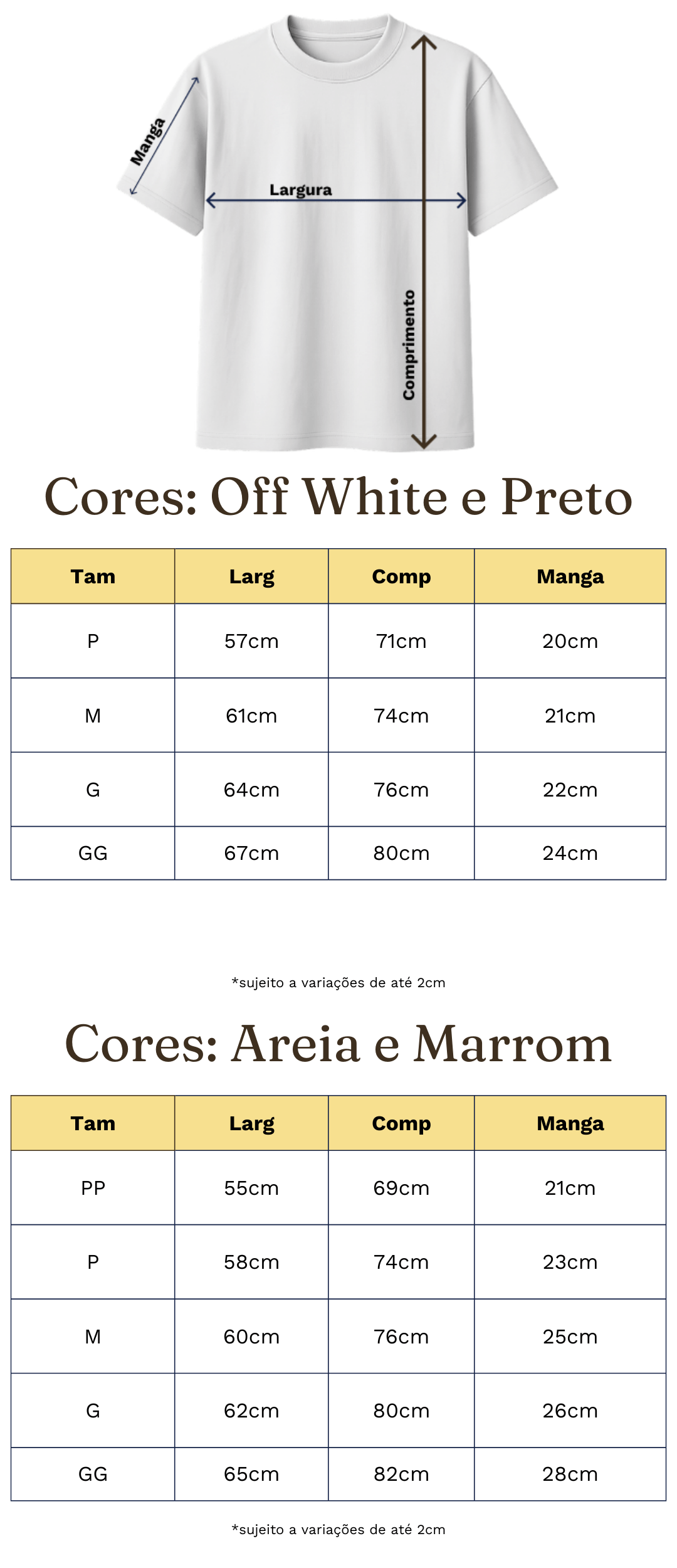 A modelagem oversized traz liberdade, sem exageros. A gola firme e o reforço ombro a ombro mantêm a estrutura, mesmo após muitas lavagens.